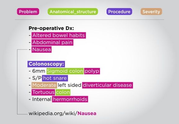 Along with generic medical NER annotation, we can also work on domain specific annotations like oncology, radiology, etc. Here are the oncology specific NER entities that can be annotated – Cancer problem, Histology, Cancer stage, TNM stage, Cancer grade, Dimension, Clinical status, Tumor marker test, Cancer medicine, Cancer surgery, Radiation, Gene studied, Variation code, Body site